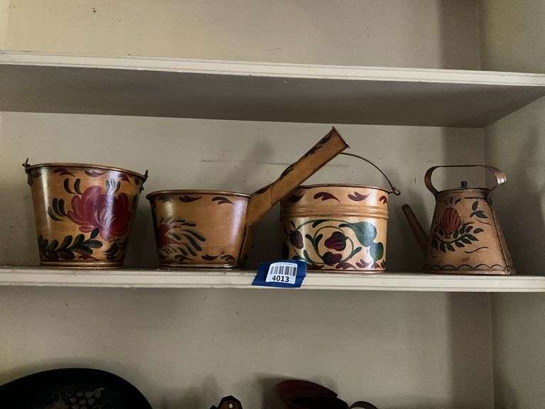 Contents of shelf: four pcs tole painted tinware Hurley Real Estate