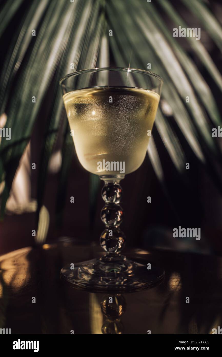 chilled white wine cocktail on brass gold table with palm tree