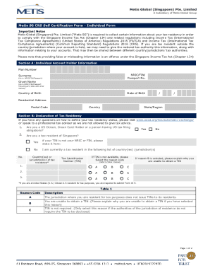 Fillable Online Metis SG CRS Self Certification Form Individual Form