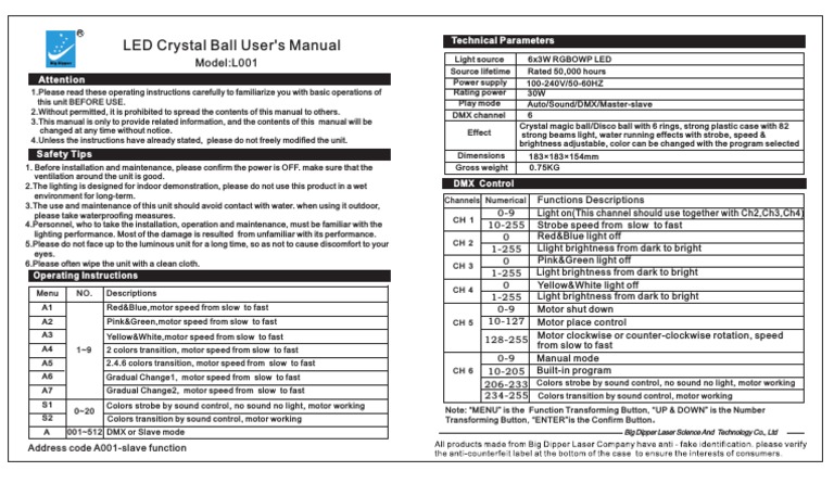 LED Crystal Ball User #39 s Manual: Model:L001 PDF Color Optics