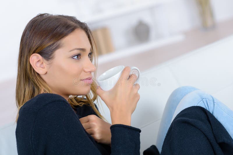 Lady Cuddled Up on Sofa with Cup Drink Stock Photo Image of
