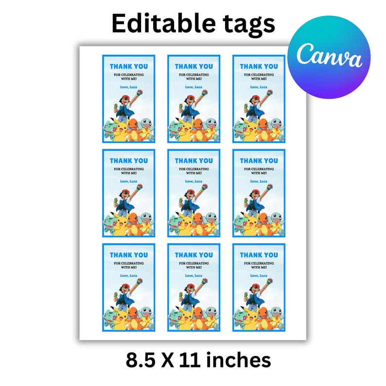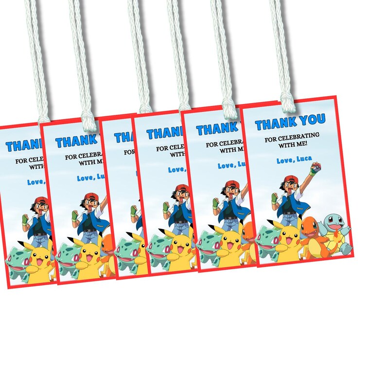 Editable Pokemon Birthday Thank You Tags Instant Download Custom Gift