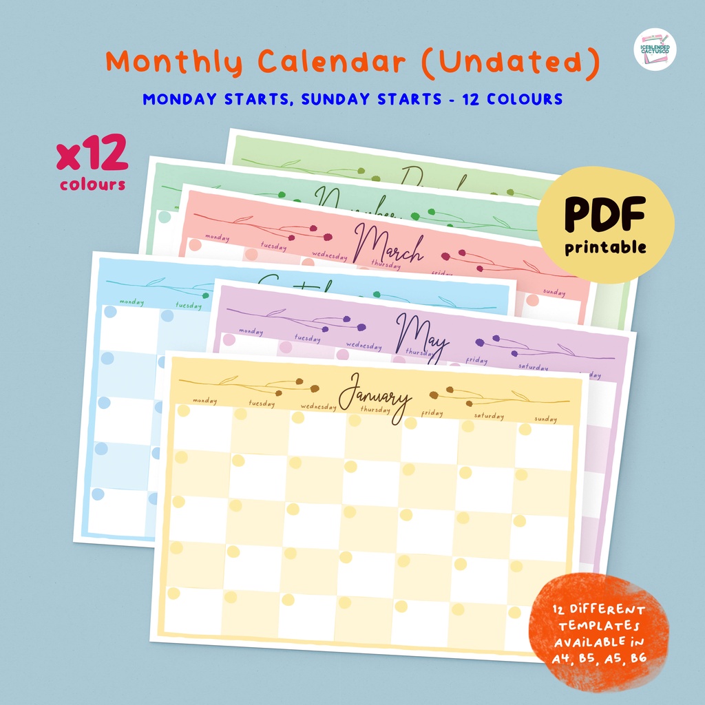 Undated Monthly Calendar Digital Cute Stationery 7 Pastel Colors