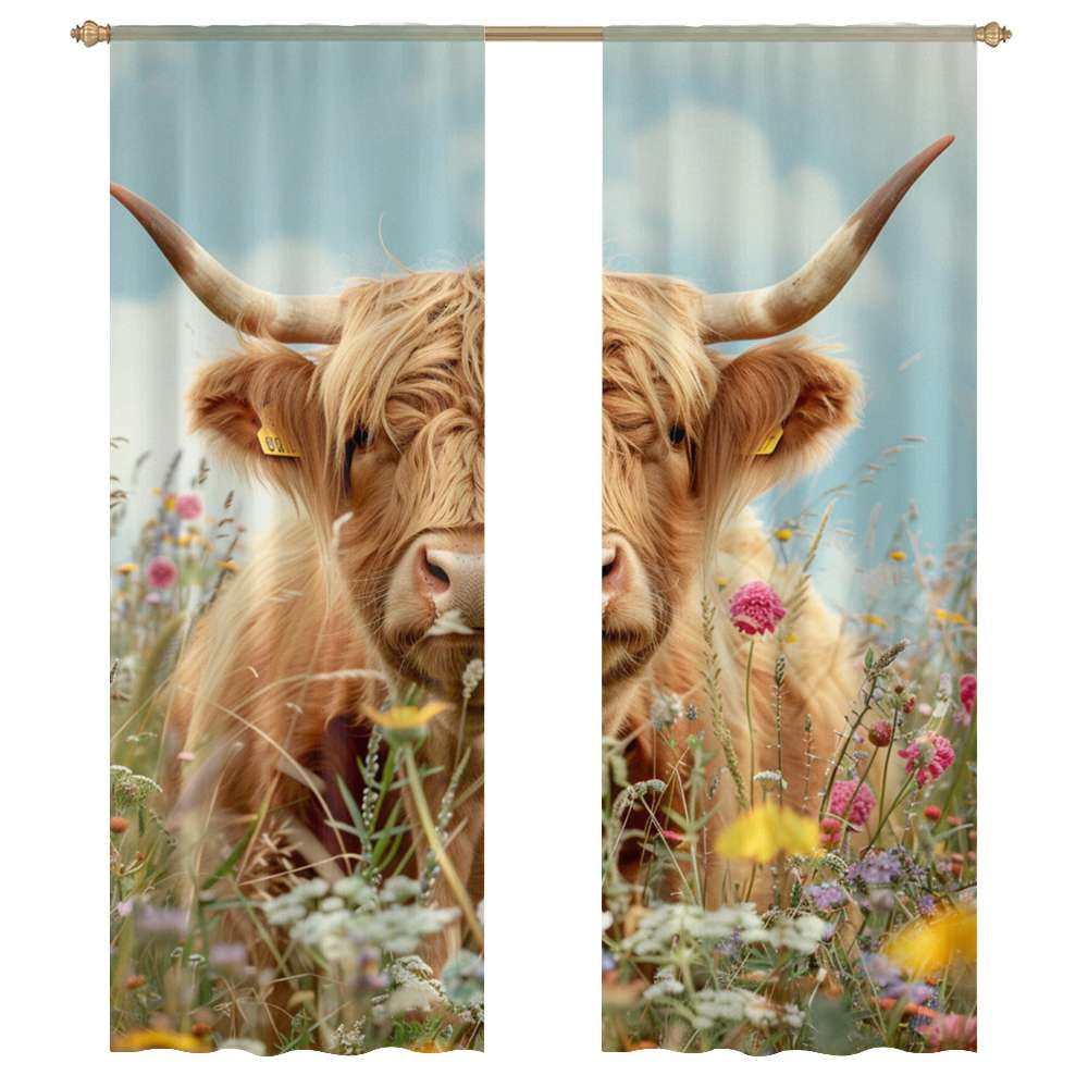 CUTE HIGHLAND COW WILD FLOWERS Tulle Curtains For Living Room Chiffon