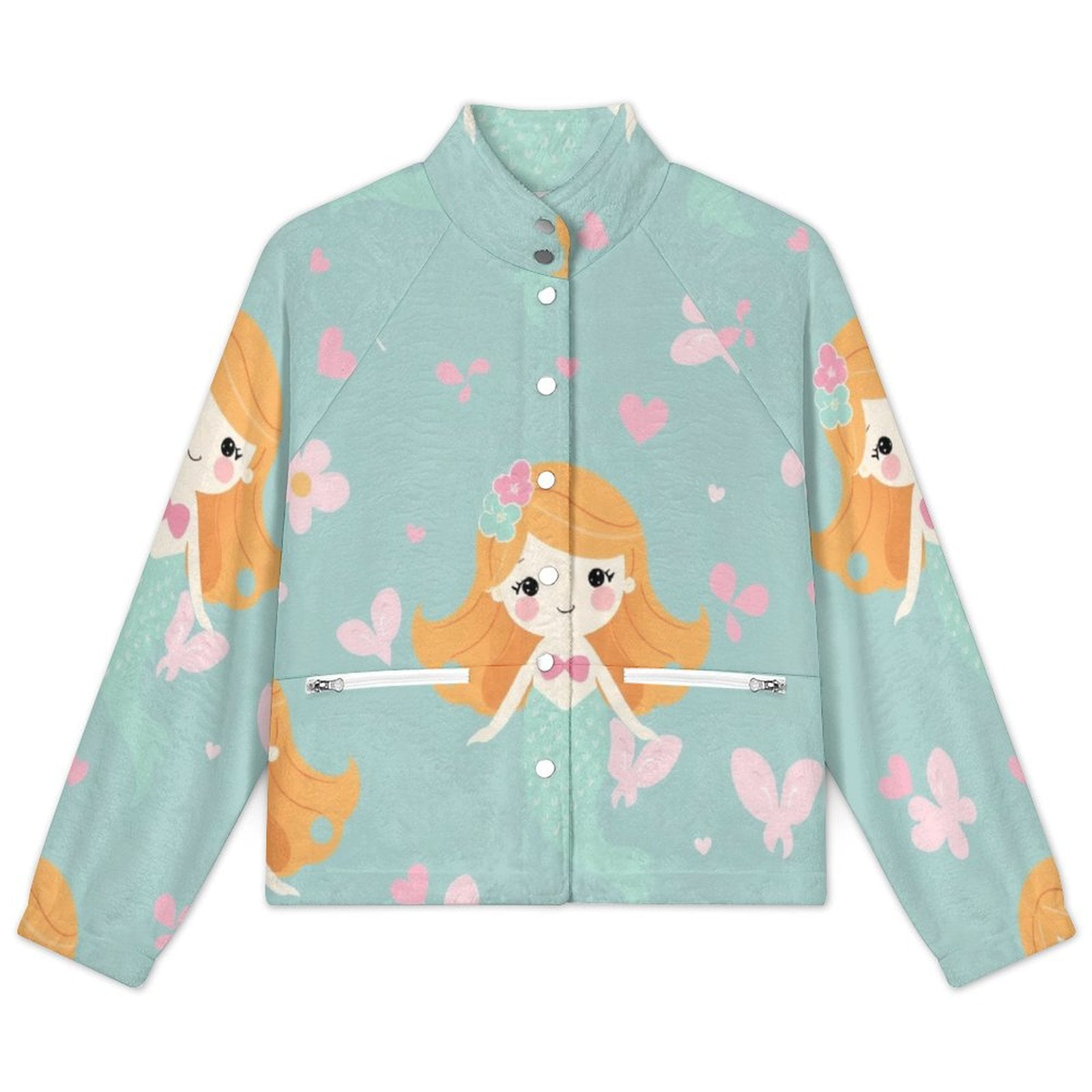Cute Mermaid Pattern Warm Women #39 s Plush Jacket Stand Collar Full Sleeve