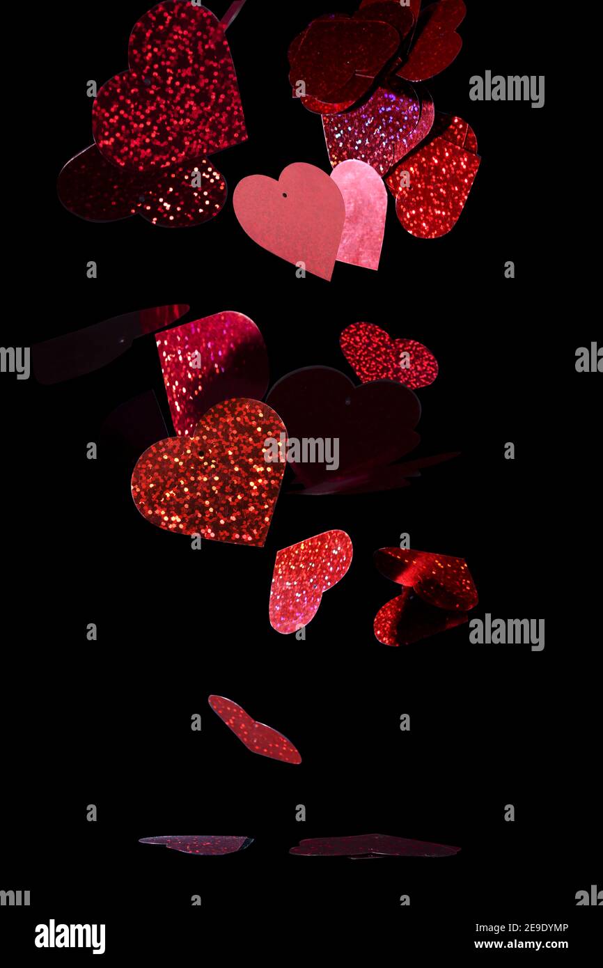 Closeup glittery red cutout hearts against a black background