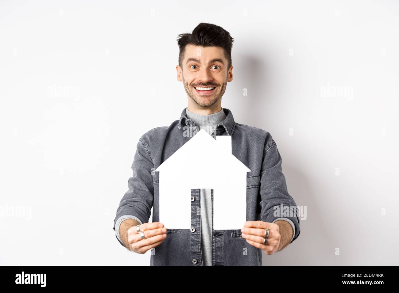 Real estate and insurance concept Handsome young guy showing paper