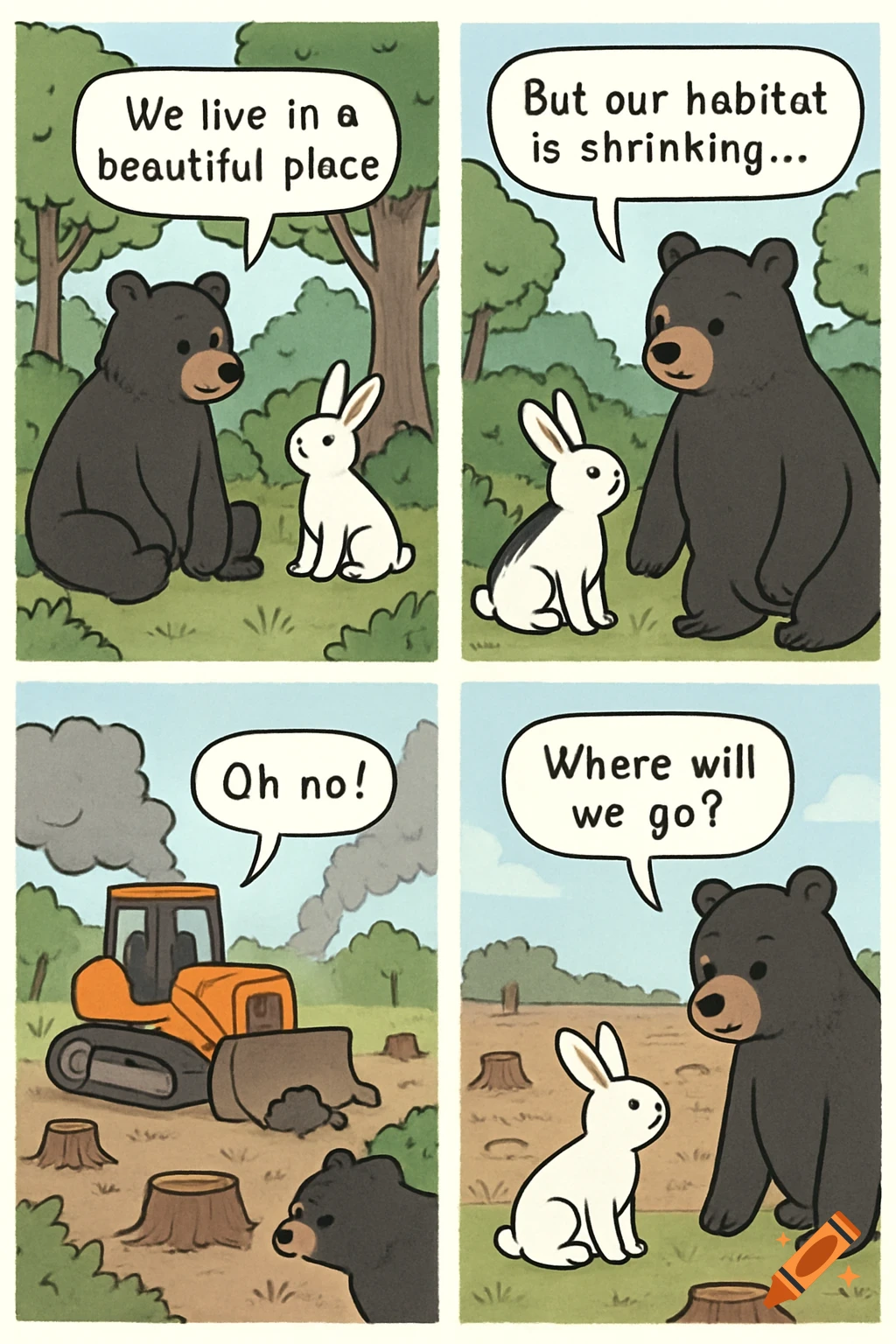 A 4 panel cartoon comic shows a bear and rabbit discussing habitat loss