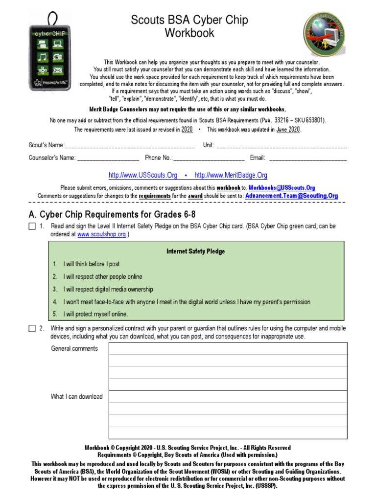 Scouts BSA Cyber Chip Workbook PDF Boy Scouts Of America Internet