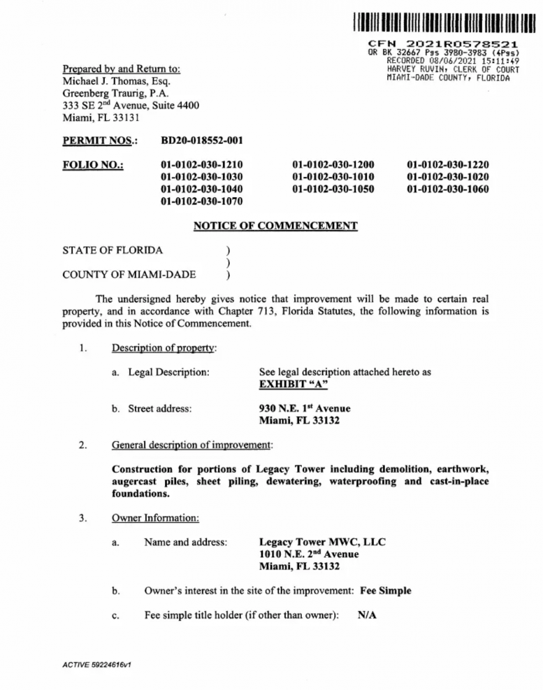 RPC Files Notice Of Commencement For 691 Foot Tall Legacy Miami