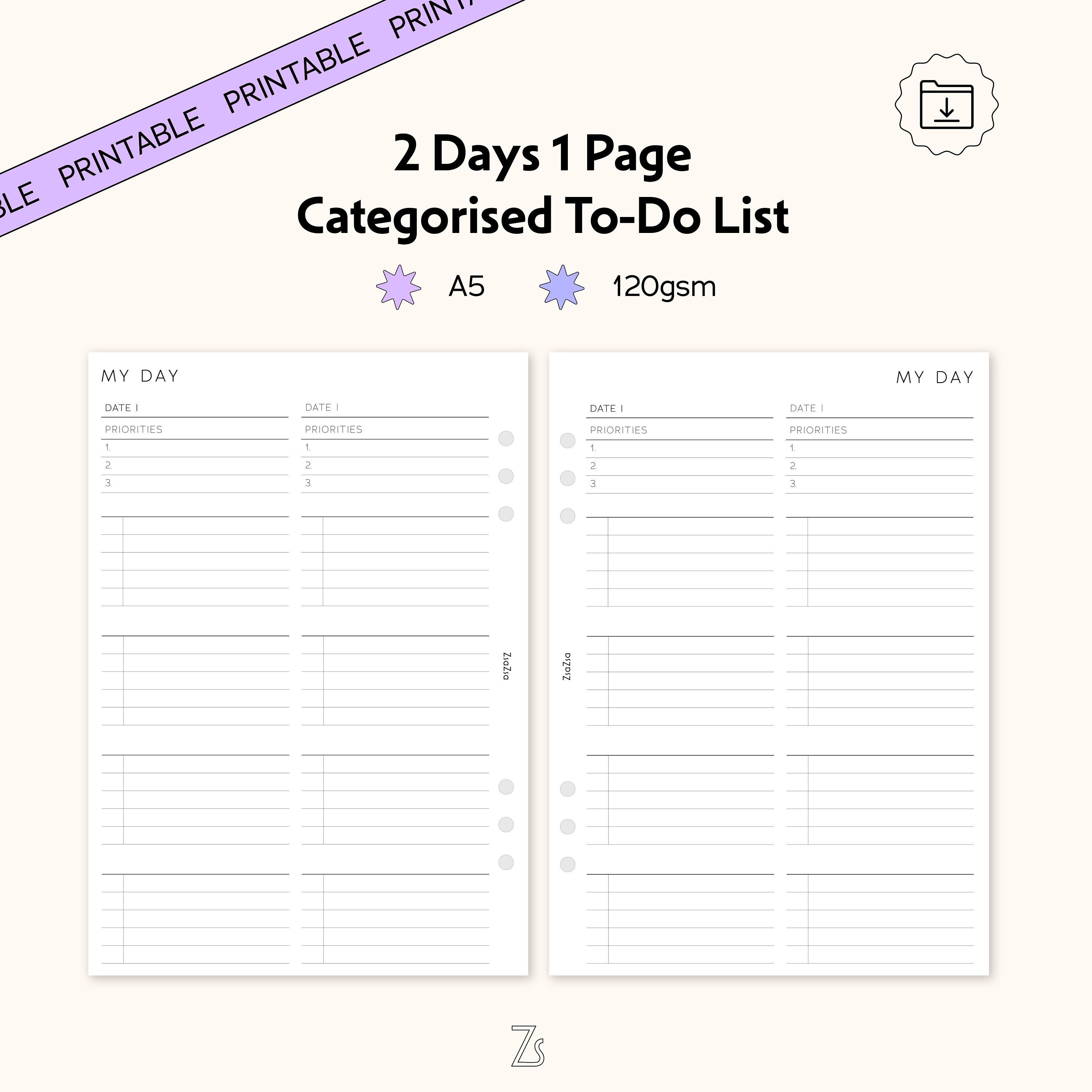 A5 Printable Minimal Daily Planner Insert 2 Days per Page A5 Filofax