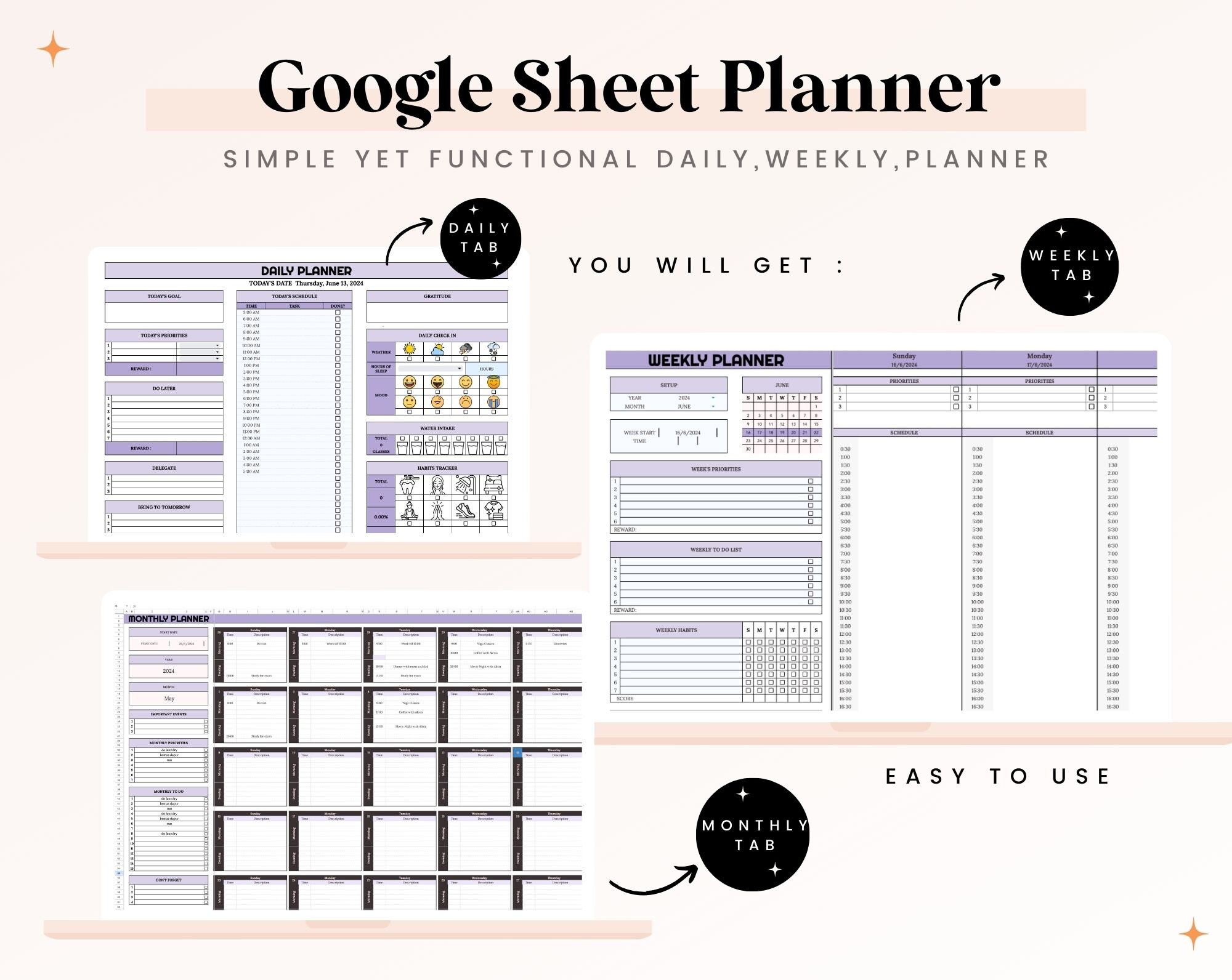 Google Sheets Weekly Planners Monthly Calendar Daily Schedule #