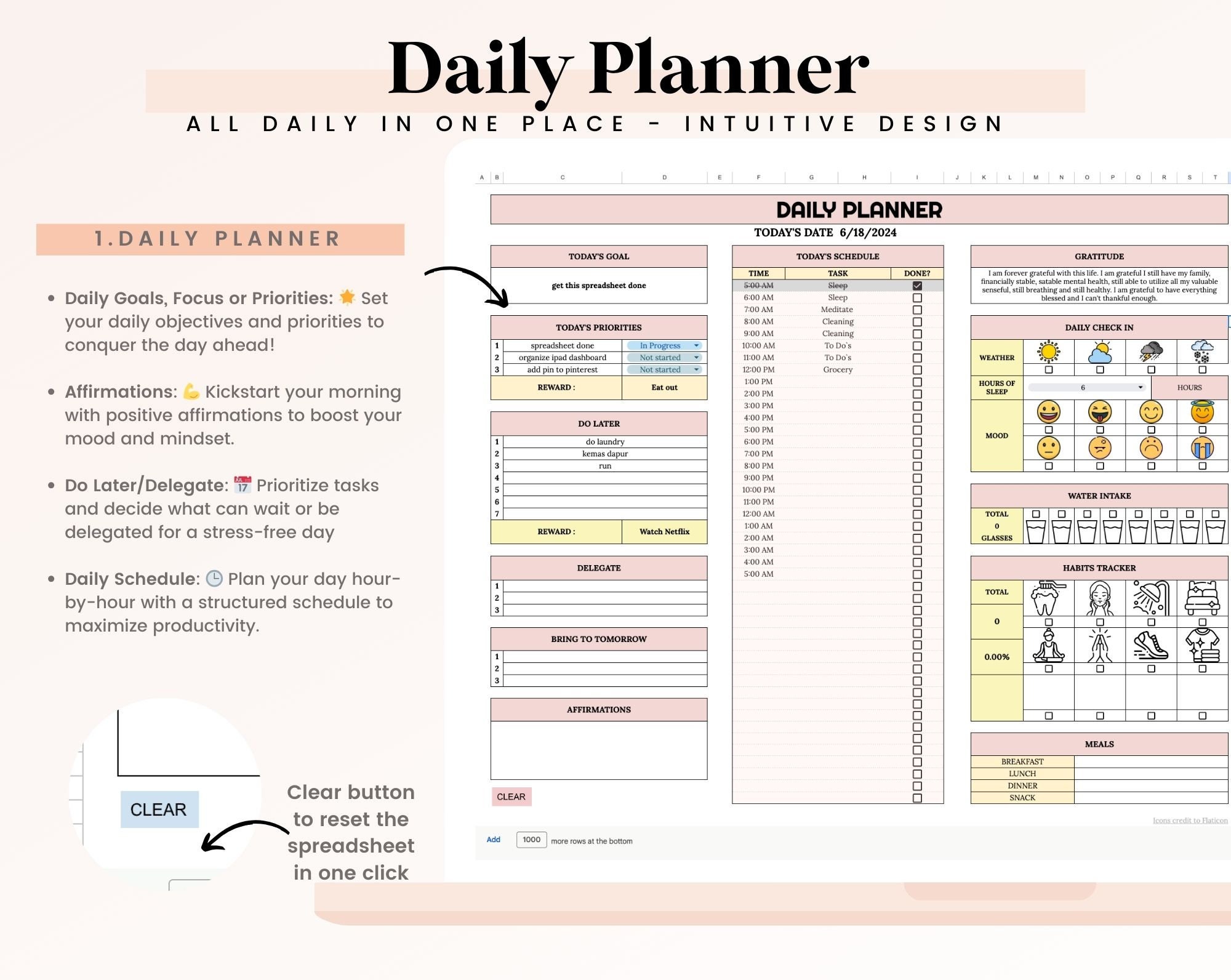 Daily and Weekly Planner Google Sheets Template Clear Button to Do