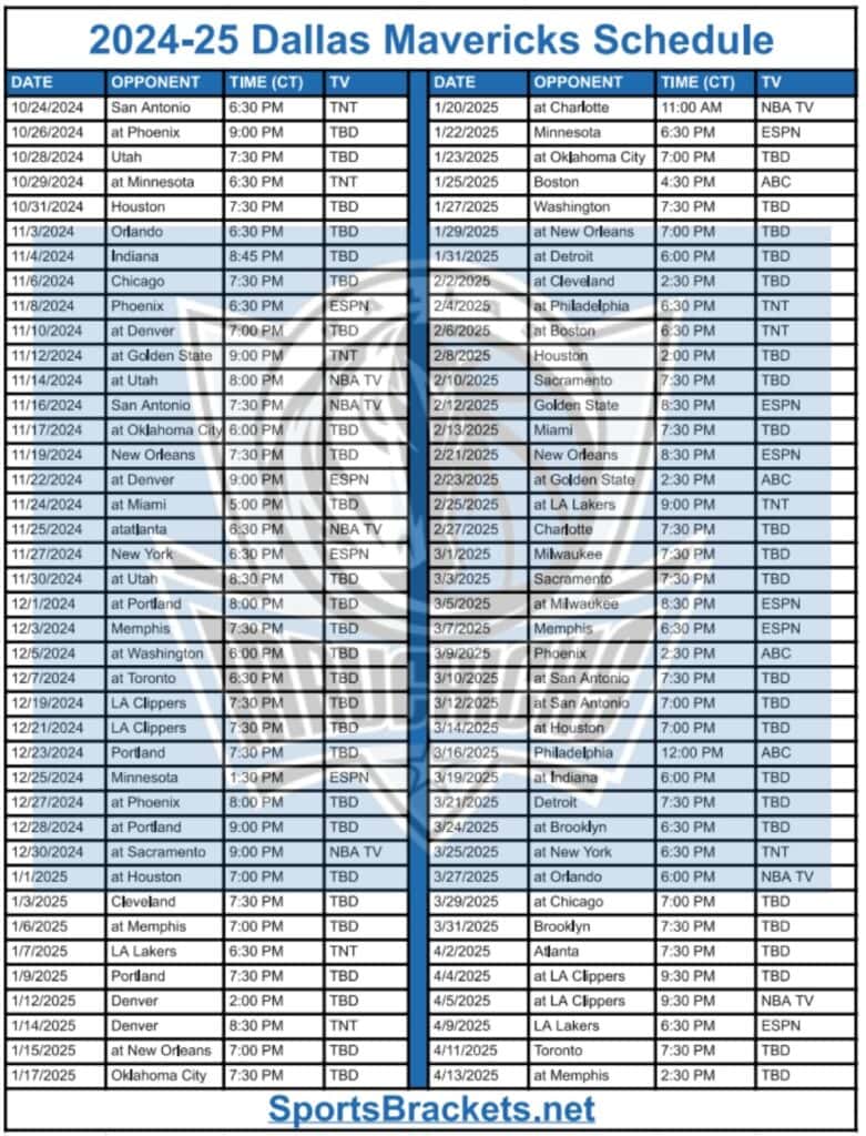 Printable 2024 25 Dallas Mavericks Schedule TV Broadcasts and Matchups