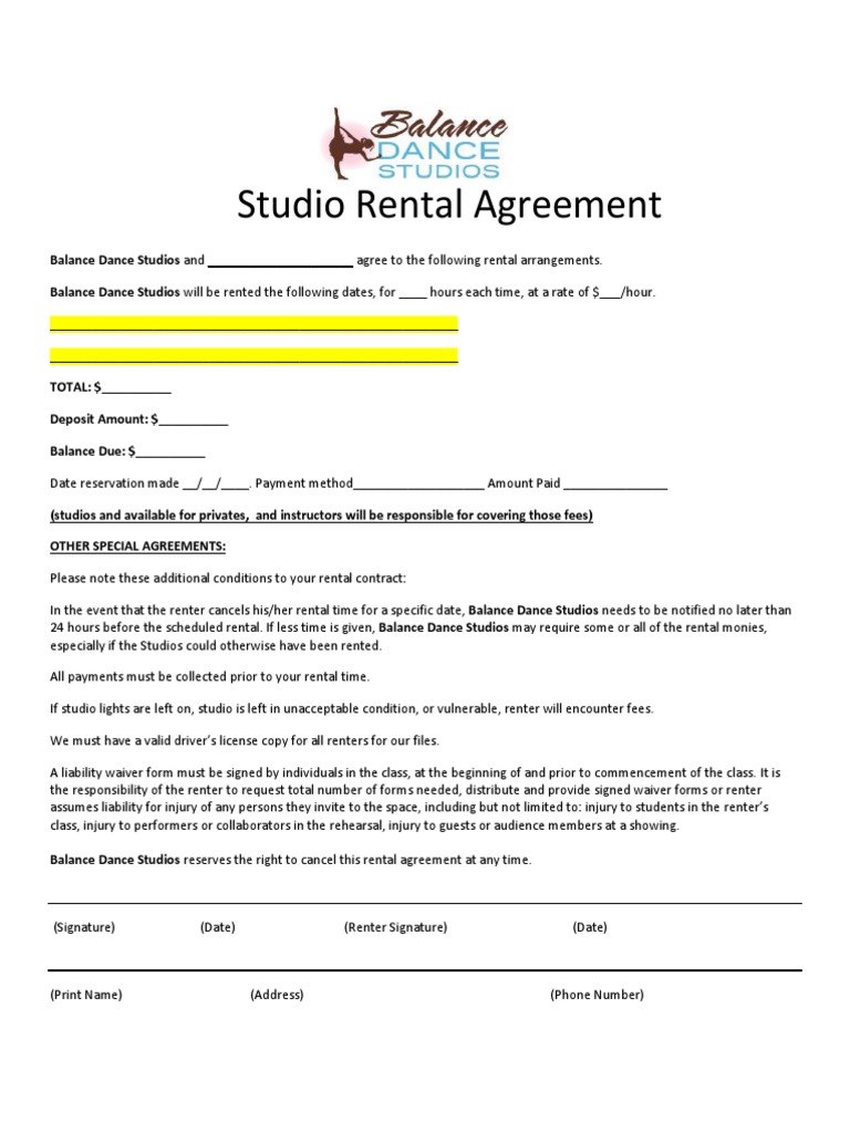 Online Waiver Studio One Yoga in Dance Studio Rental Agreement