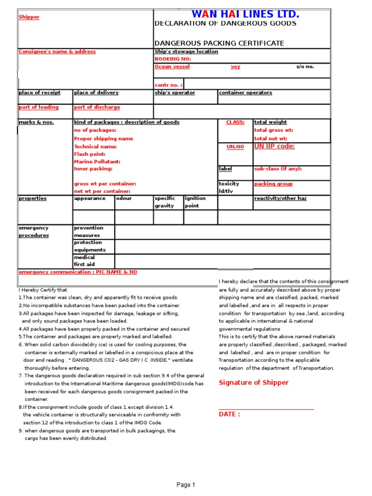 Declaration of Dangerous Goods Dangerous Packing Certificate PDF