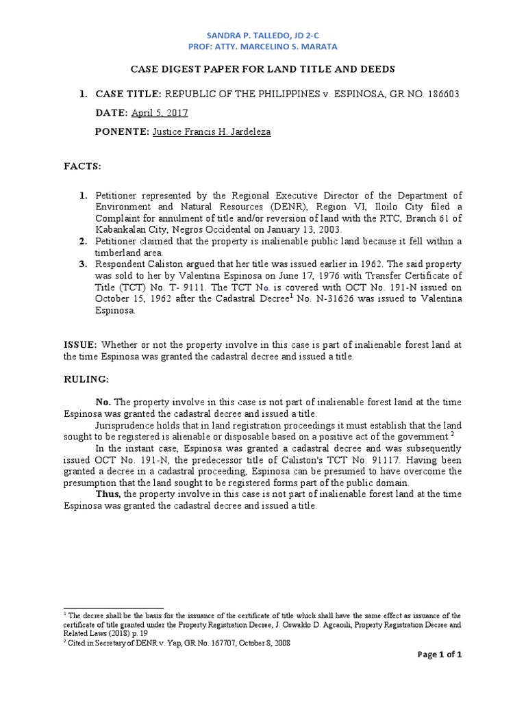 Land Title Case: Republic v Espinosa PDF Supreme Court Of The