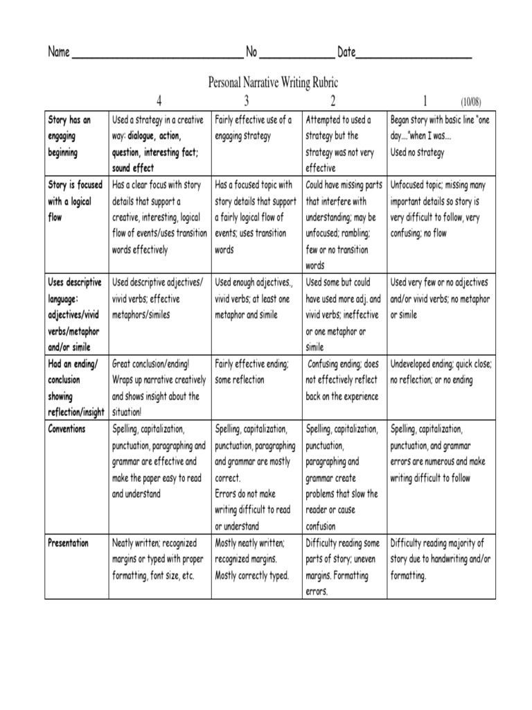 Personal Narrative Descriptive Writing Rubric Essay writing examples