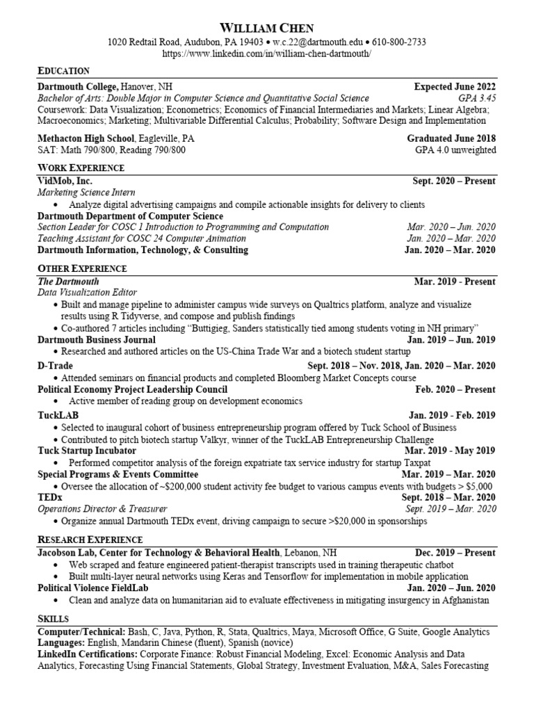 Resume William Chen Dartmouth PDF