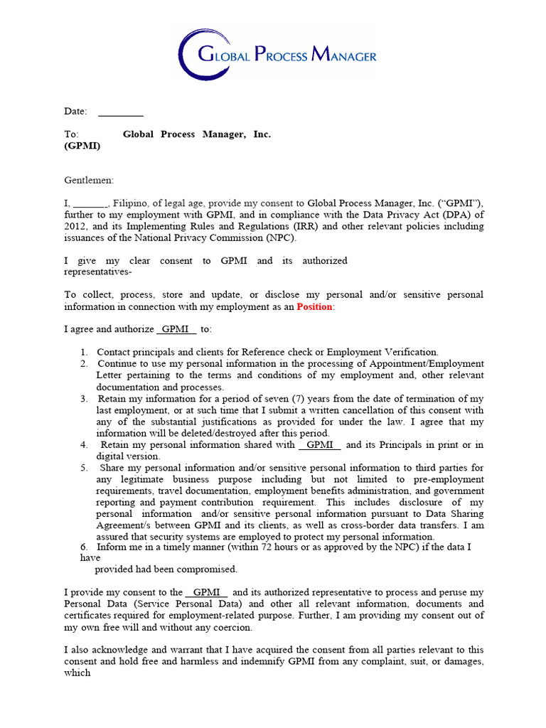 Data Consent Form Template PDF Employment Consent