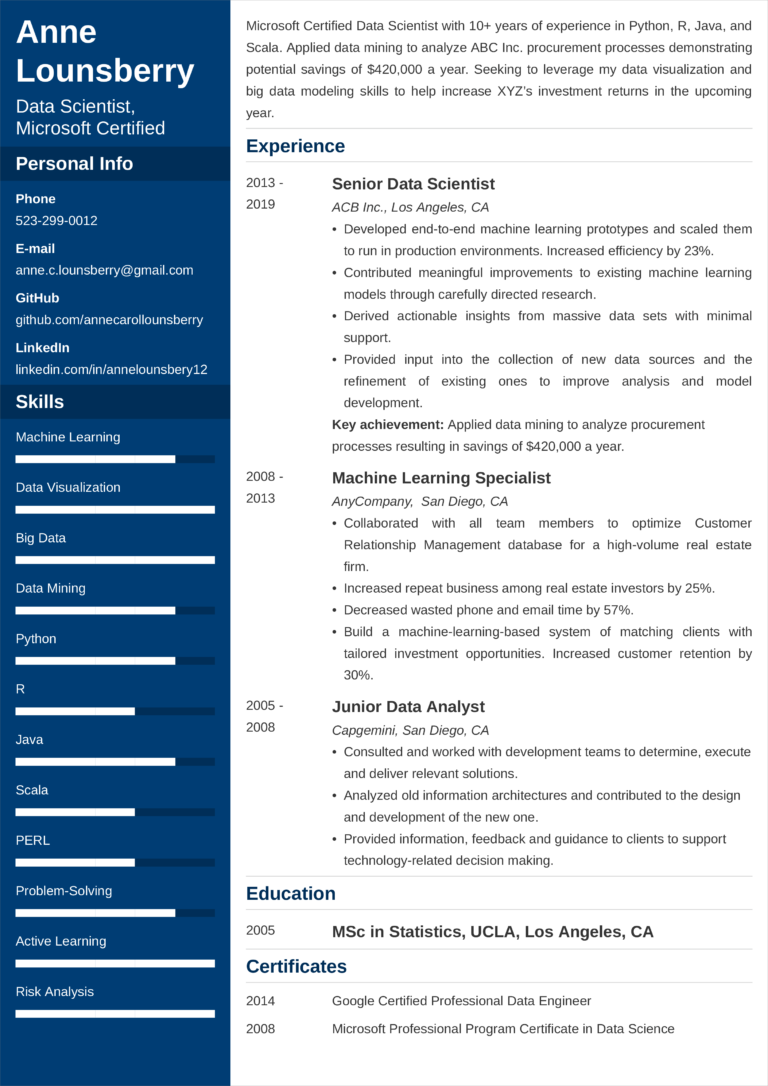 Data Scientist CV Example for 2023 (Skills Templates)