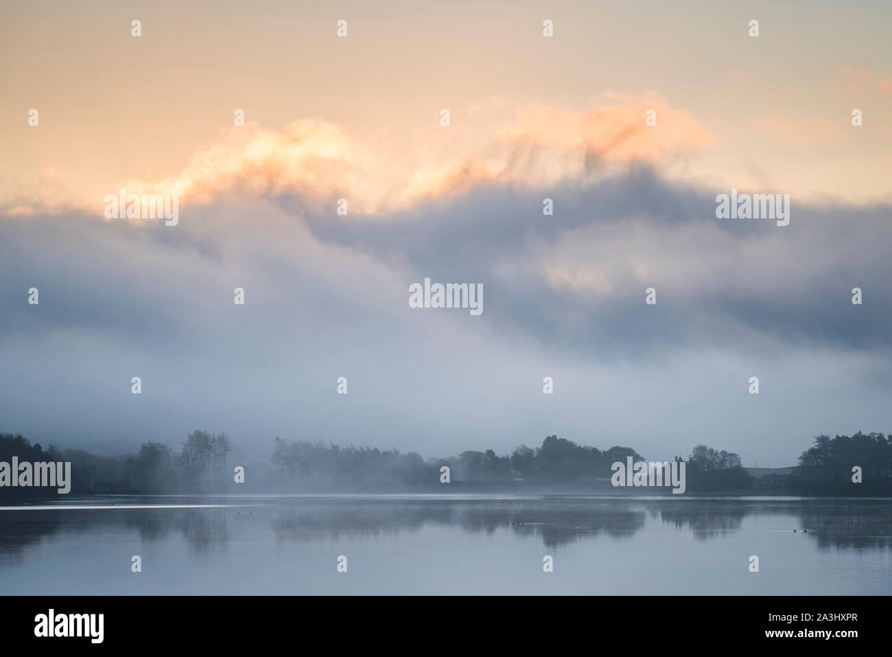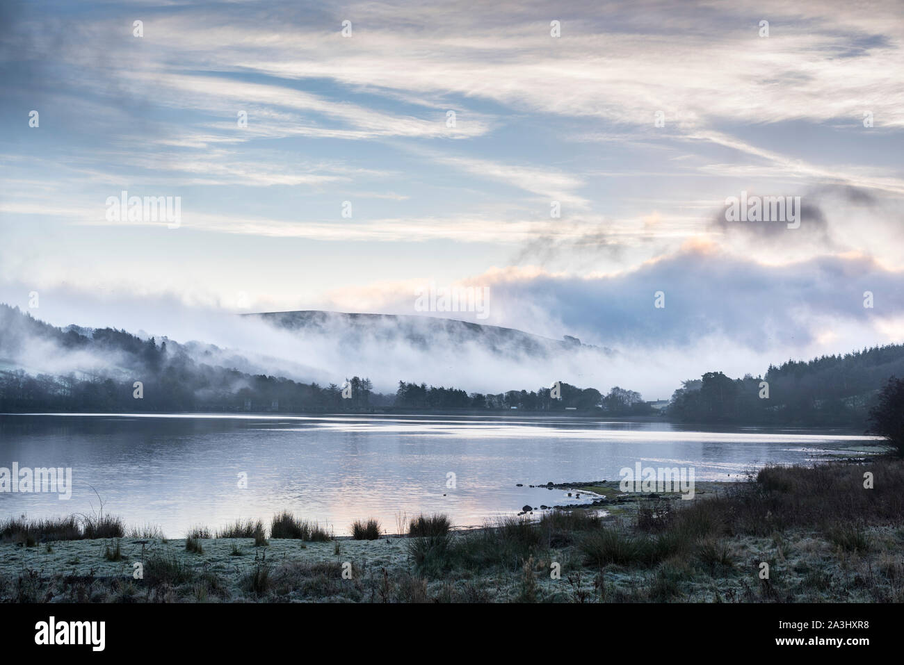 Dawn mist Gouthwaite Reservoir near Pateley Bridge in Nidderdale North