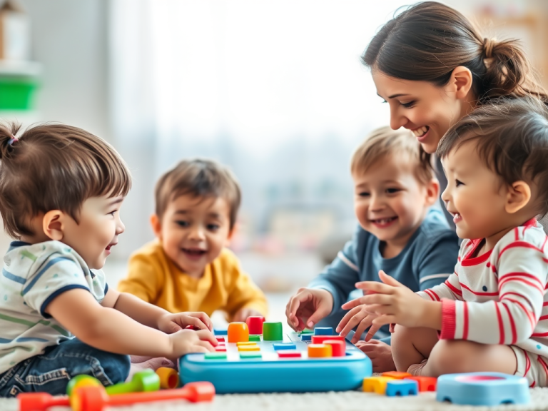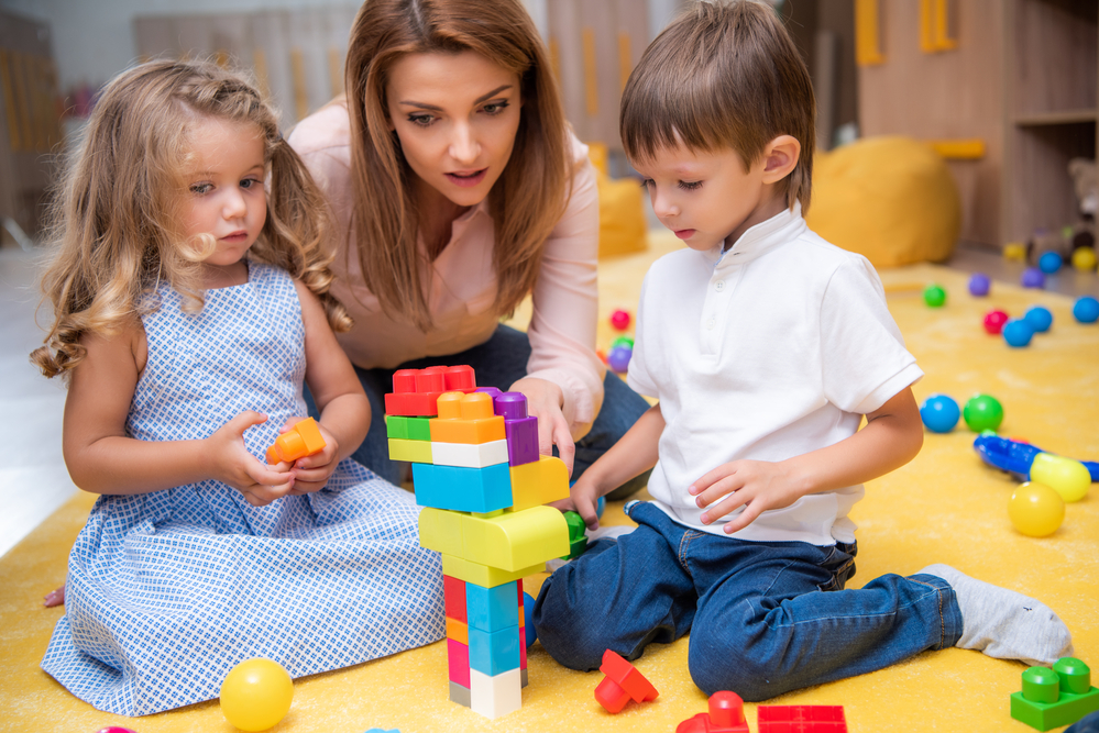 Babysitter and Children Playing Together in Nursery or Day Care Centre