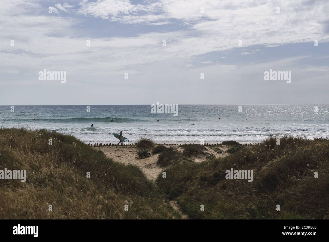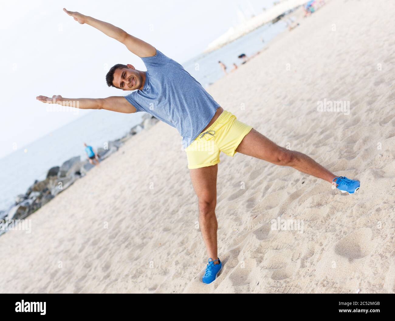 Young sporty man doing doing exercises on ocean beach at daytime Stock