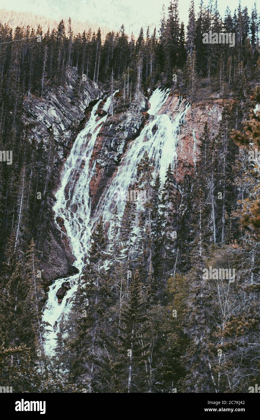 Vertical shot of the waterfalls surrounded with trees on the hill