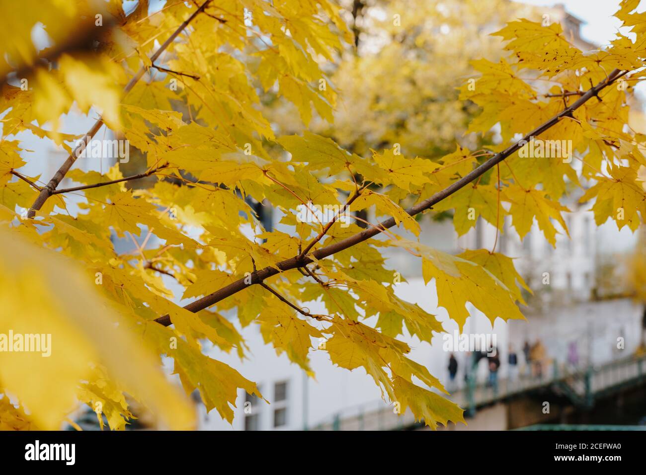 Closeup of a tree covered in yellow leaves at daytime in autumn with a