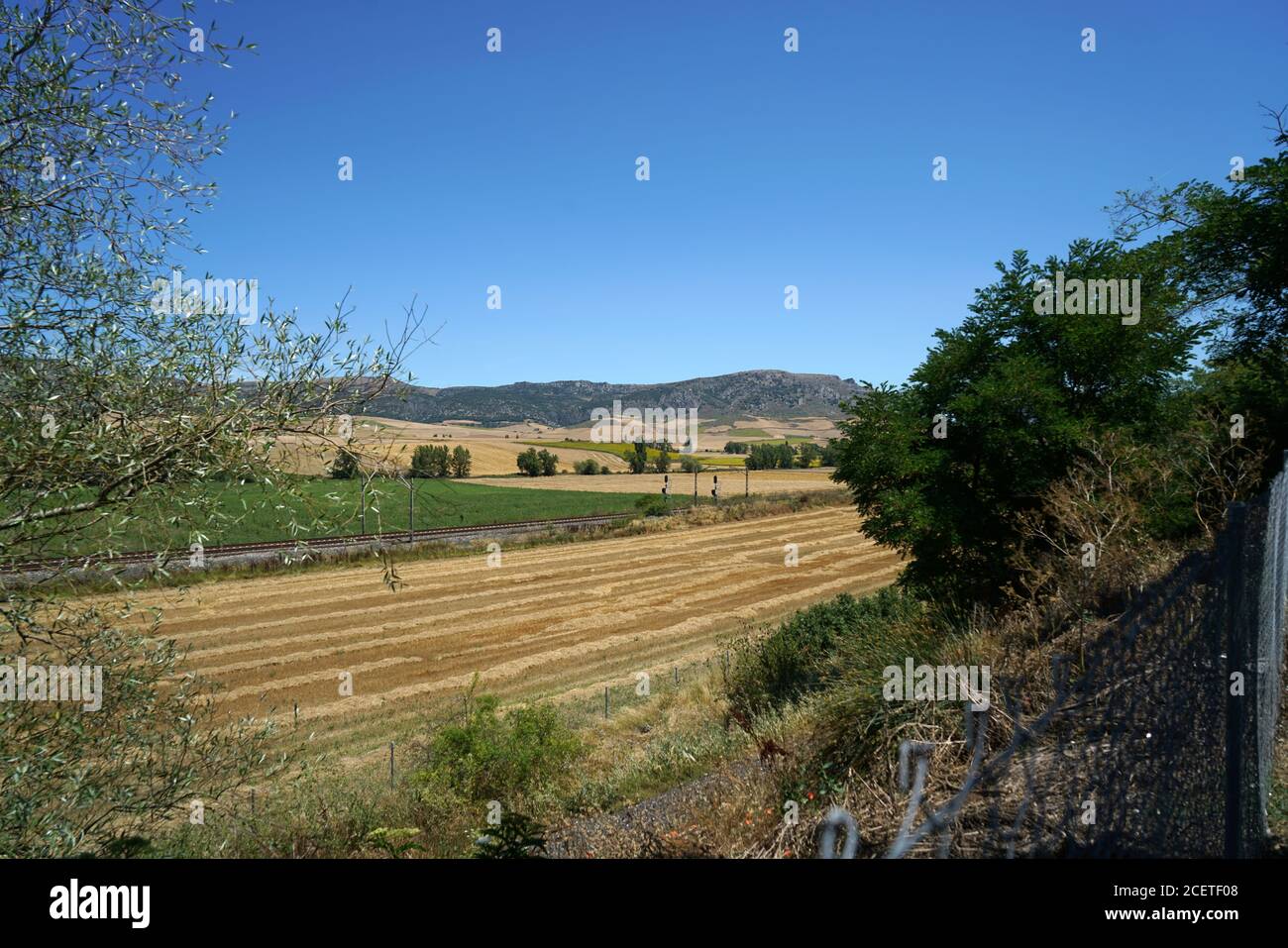Vast arid area with few trees during the daytime Stock Photo Alamy
