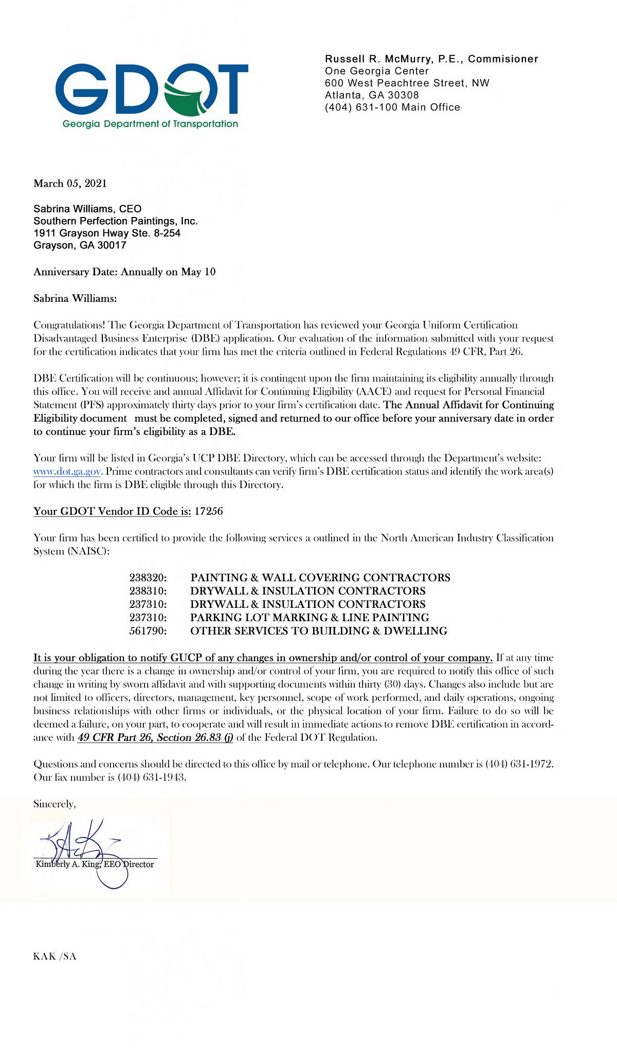 Disadvantaged Business Enterprise (DBE) Certification: Awarded