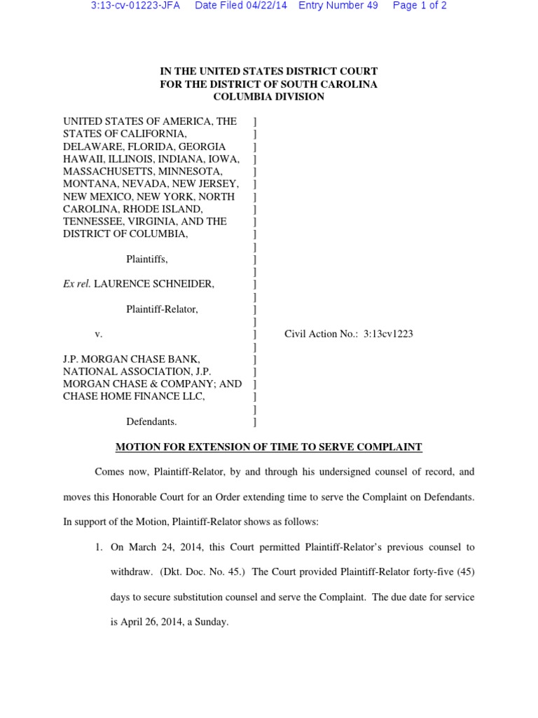 Motion For Extension of Time To Serve Complaint U S Ex Rel Schneider