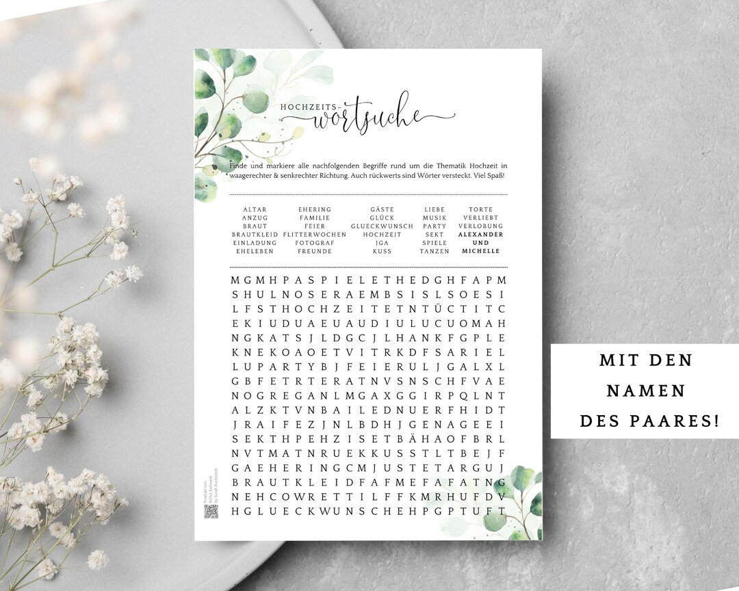 Wedding Game Crossword Puzzle With Names of the Bride and Groom