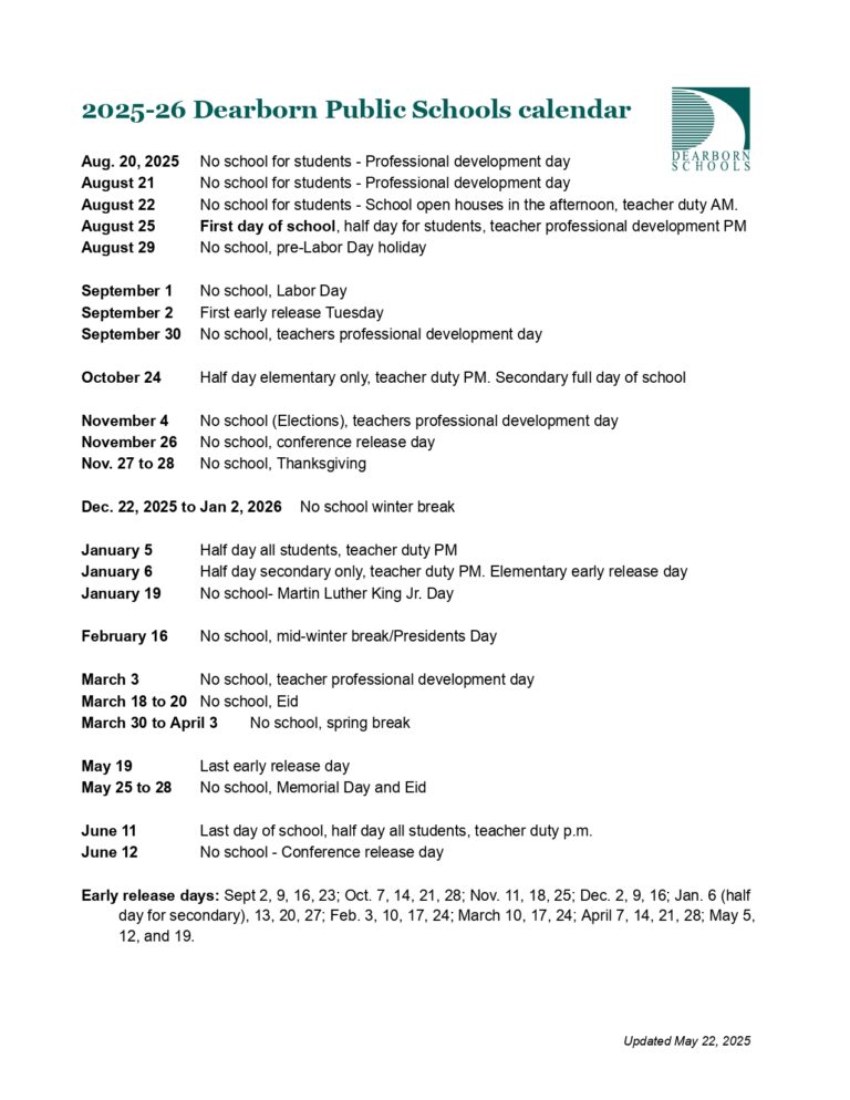 2024 2025 Dearborn Public Schools Calendar Metro Parent
