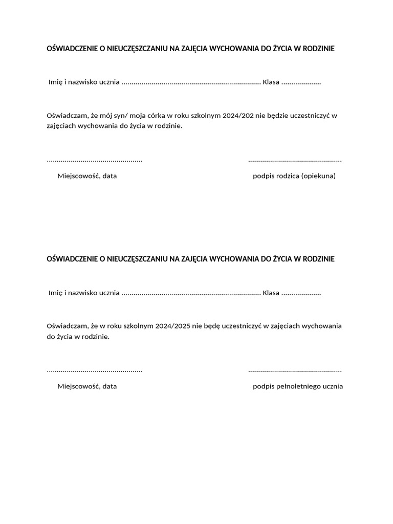 Oświadczenie o Nieuczęszczaniu Na Zajęcia Wychowania Do Życia W