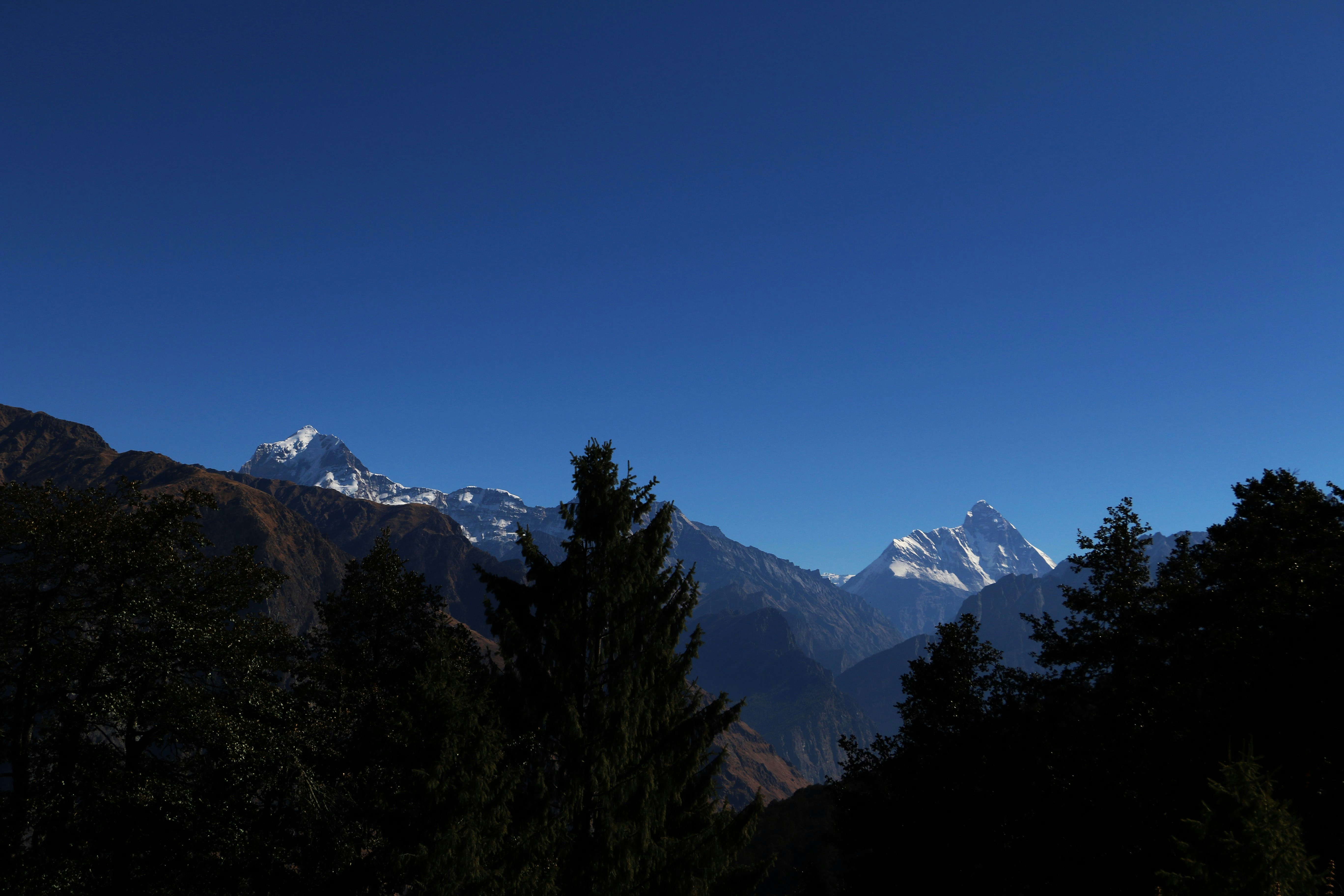 A view of a mountain range with trees in the foreground photo Free