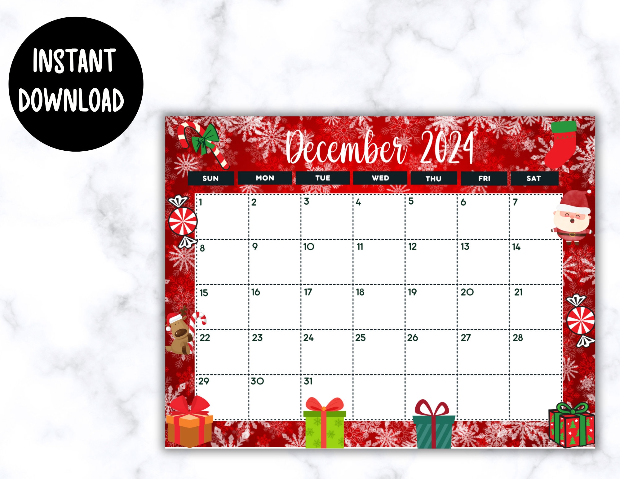 EDITABLE Printable December Calendar 2024 Christmas Calendar Holiday