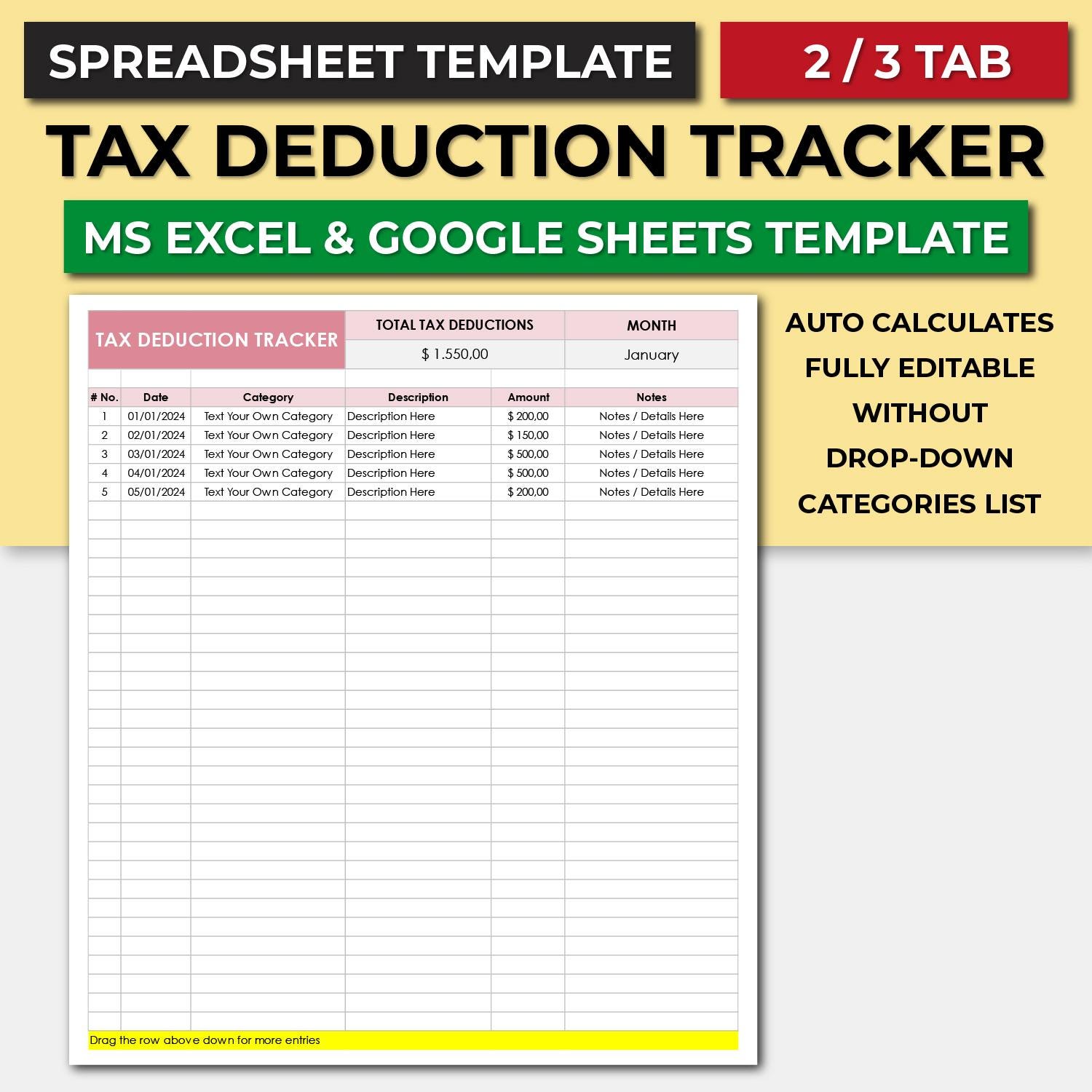 Tax Deduction Tracker Excel Spreadsheet Editable Tax 01/09/2023