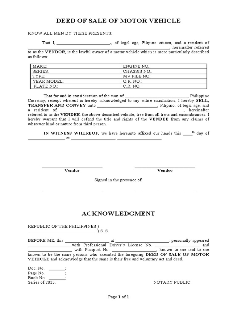 Deed Of Sale Motor Vehicle Philippines Word Templates Sample Printables
