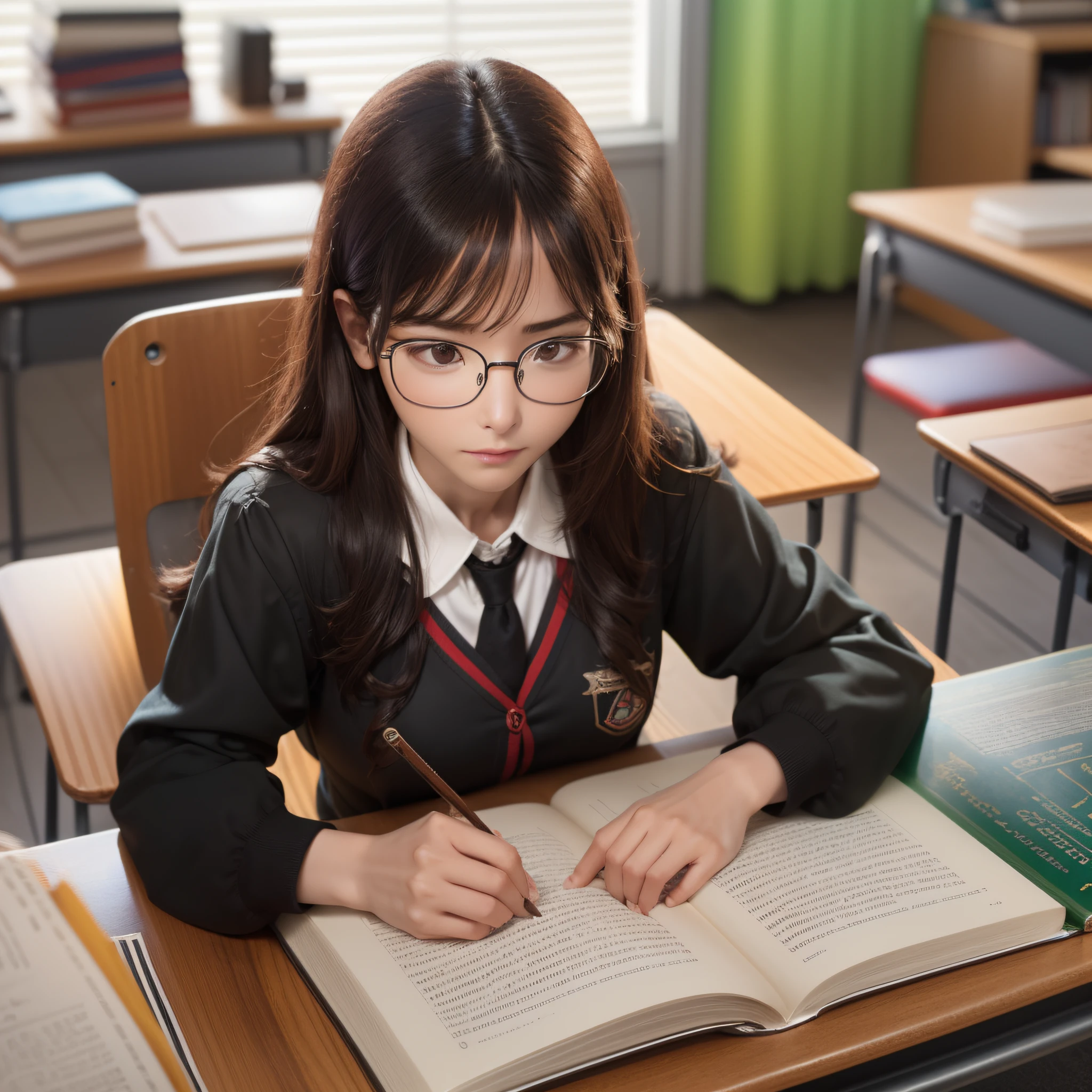 Arafed girl in a school uniform sitting at a desk with a book SeaArt AI