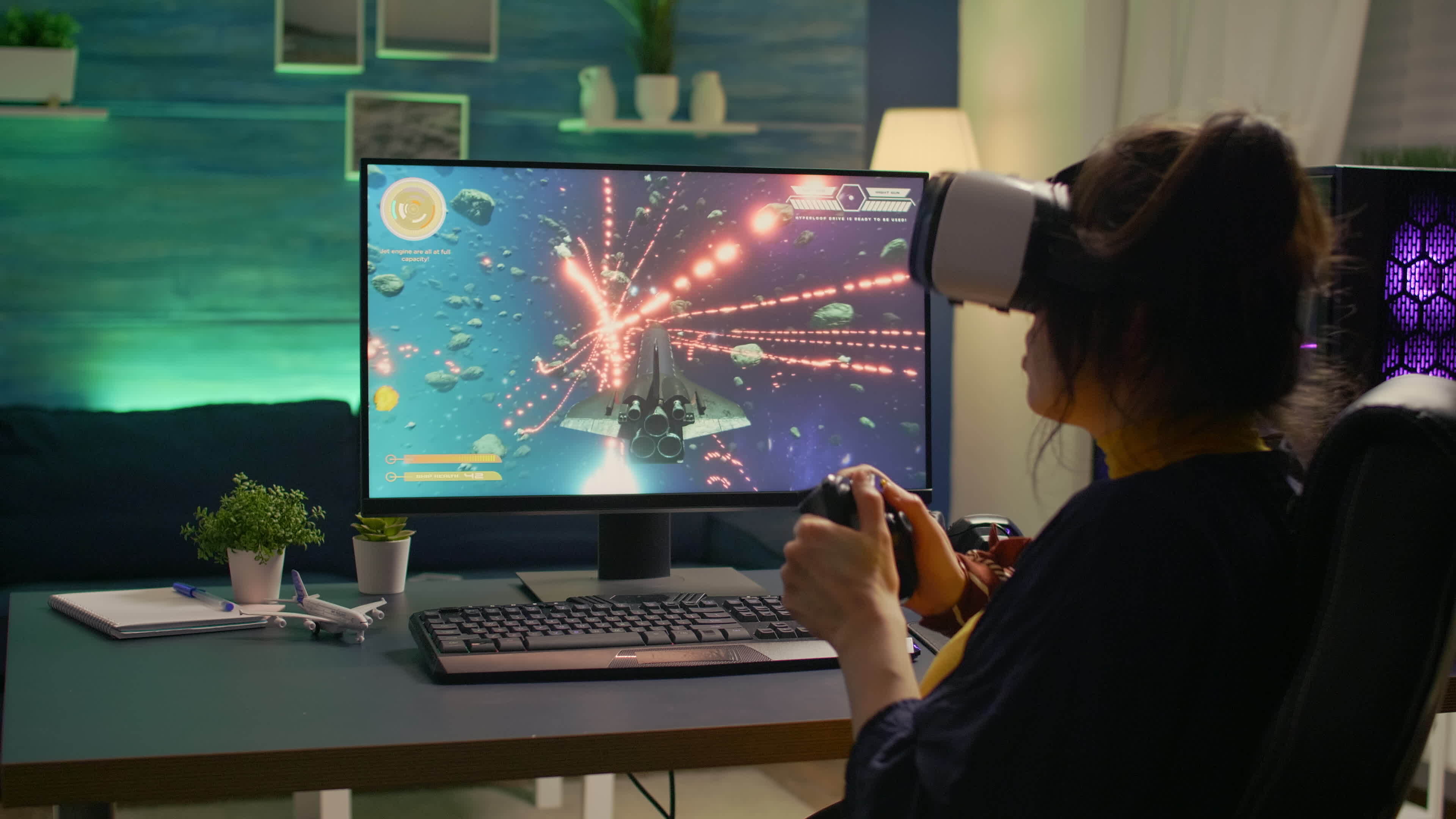 Pro gamer losing space shooter competition while wearing virtual