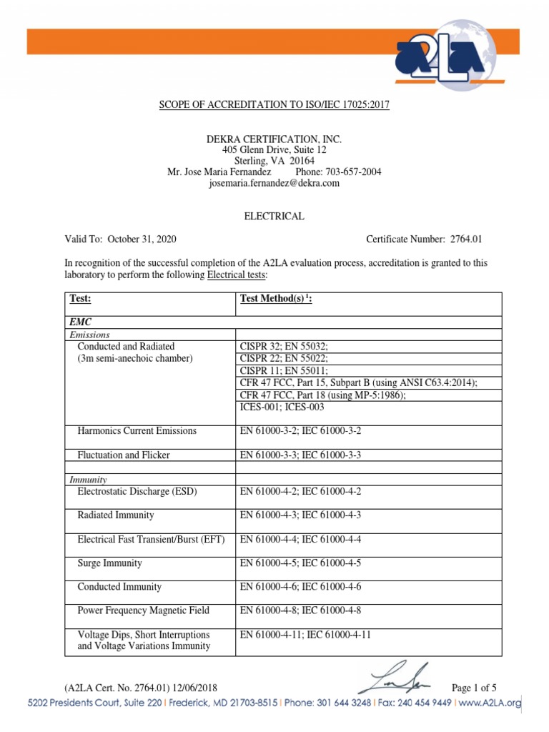 Ilac A2la Certificate and Scope Dekra Testing and Certification Inc