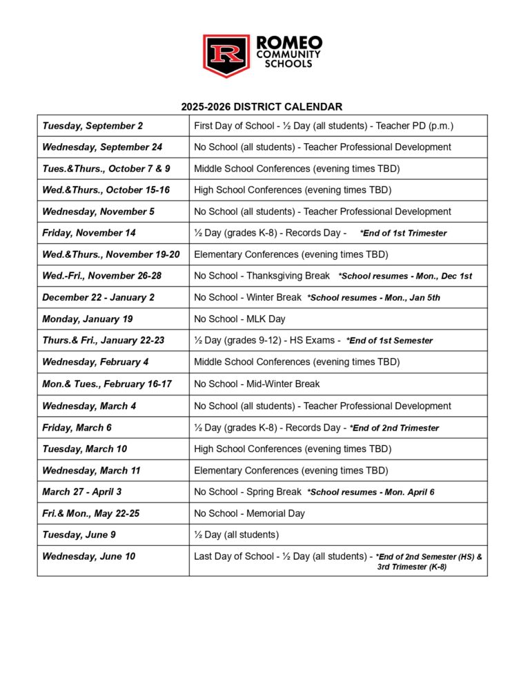 Romeo Community Schools MI Calendar 25 26 Revised pdf EduCounty