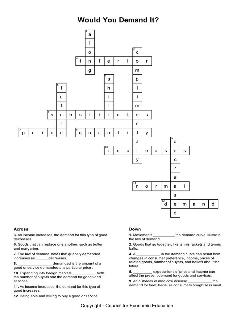 1098 Would You Demand It Crossword Answer Key1 PDF Demand Curve