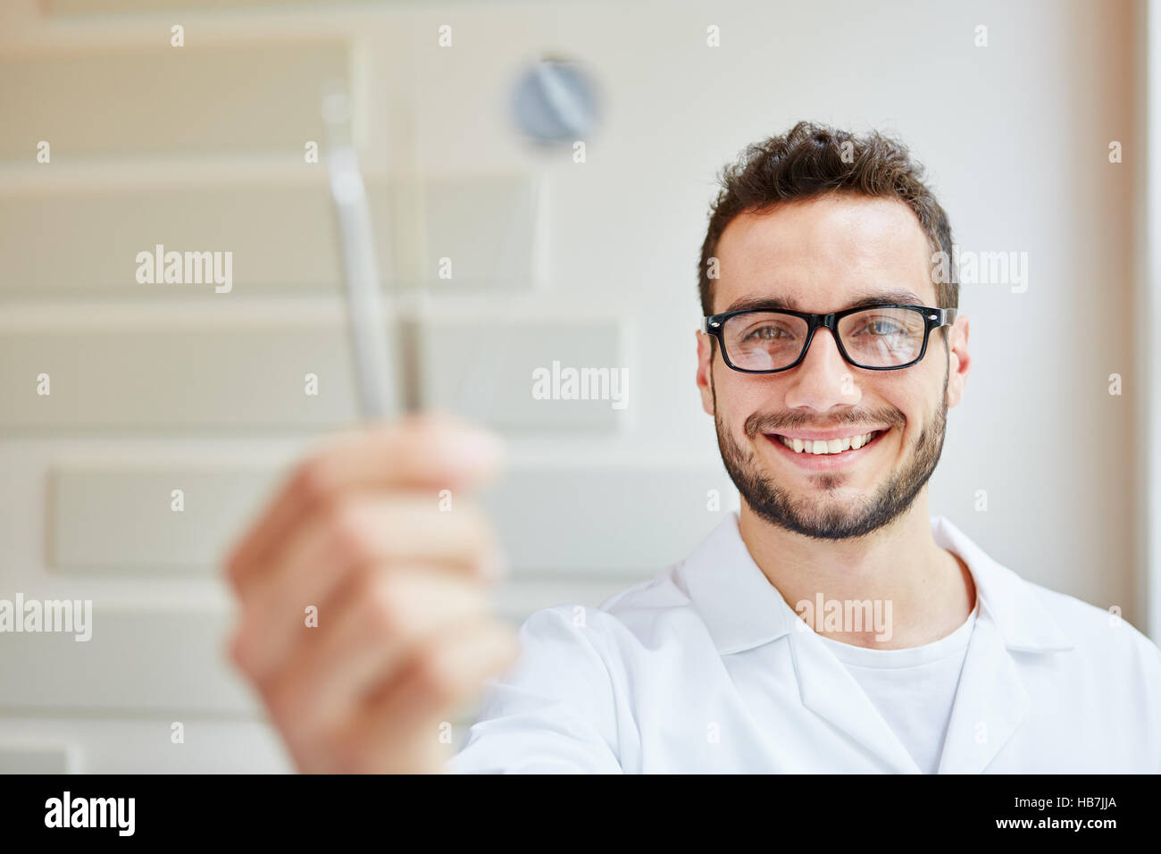 Man as dental nurse holding different tools on his hand Stock Photo Alamy