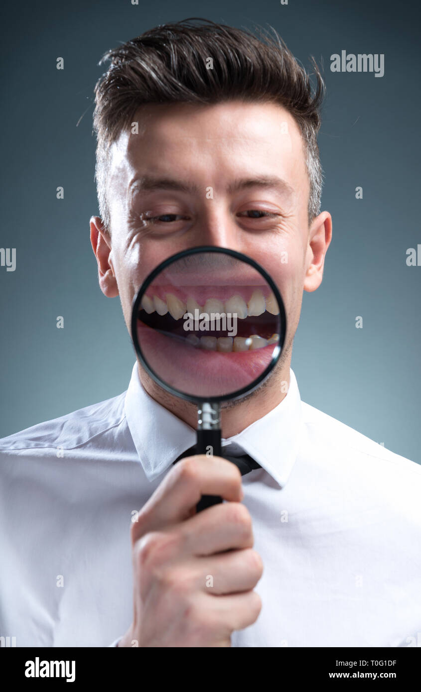 Man Holding Magnifier and Showing Teeth Stock Image Image of