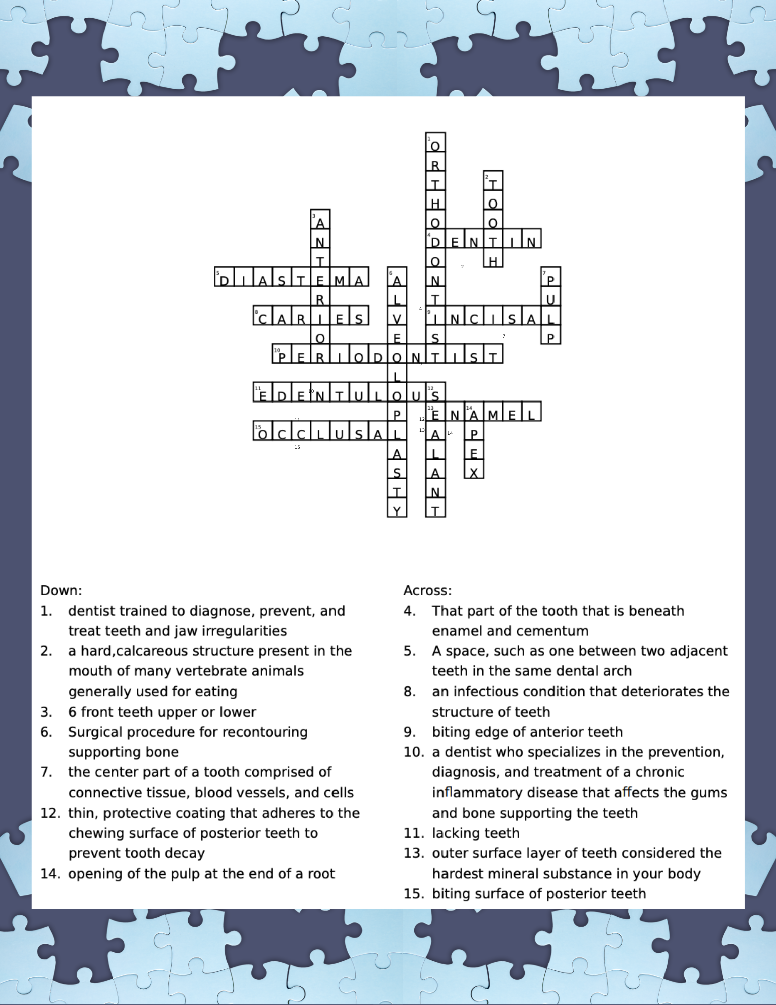 Dental Terminology Crossword Puzzle