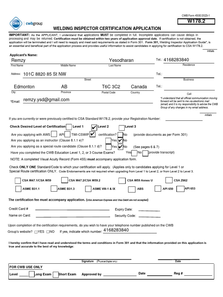 0450E 2023 1 Welding Inspector Certification Application PDF