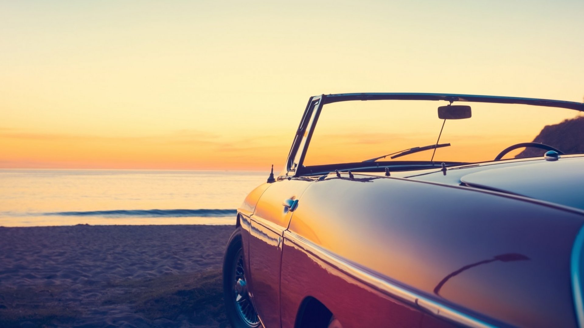 A vintage convertible car parked on a sandy beach at sunset Premium
